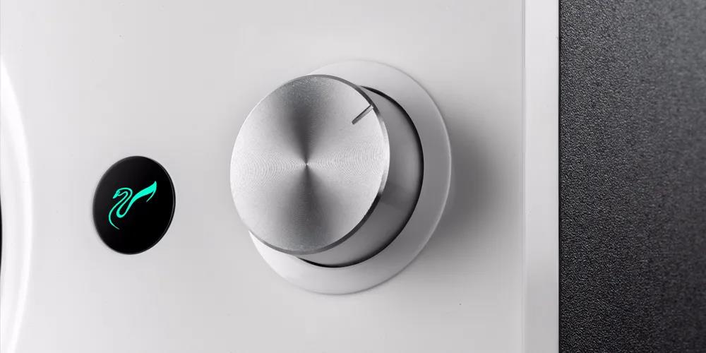 超低音前面板配備總音量調(diào)節(jié)旋鈕,通過點(diǎn)按該旋鈕還可以進(jìn)行輸入信號(hào)通道的切換,近場聽音時(shí)可輕松操控。
