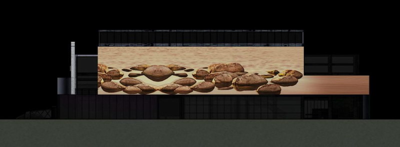 展示方式以立體投影為主,依托蠔鄉(xiāng)湖公園文創(chuàng)展館南側(cè)墻體,在墻體上以三維動(dòng)畫(huà)+二維動(dòng)畫(huà)+實(shí)景特效表現(xiàn)。