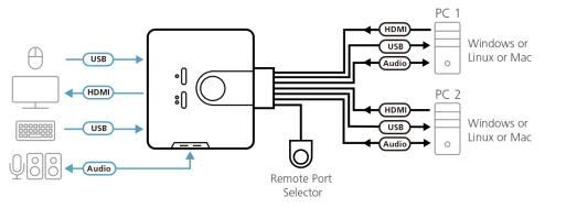電腦及音頻功能獨立切換–一臺電腦操作KVM設備,另一臺針對音頻設備做控制*