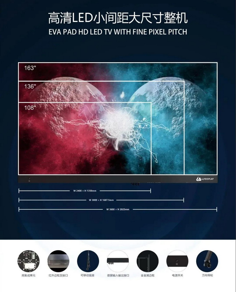 藍普視訊隆重推出 EVA PAD 高清LED小間距大尺寸一體機,作為小間距大尺寸一體機,由BSU63J的P1.2間距作為一體機的主體搭建,有著108英寸、136英寸、163英寸多種大尺寸可自由拼接,同時具備箱體本身28mm的超薄厚度,高對比度、3840Hz高刷新率、寬色域范圍帶給你更好的視覺體驗,同時多種功能、多種數(shù)據(jù)傳輸方式更適用于多種場景。
