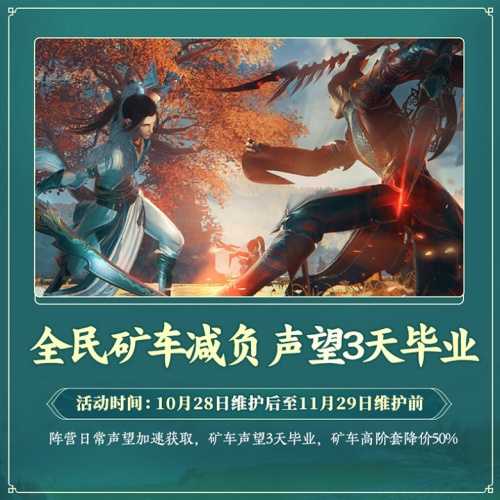 陣營對抗成長減負(fù),輕松畢業(yè)不是夢!即日起至11月29日維護前,陣營日常聲望加速獲取,礦車聲望3天畢業(yè),礦車高階套降價50%!