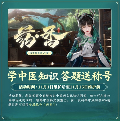 弘揚國醫(yī)文化,重現(xiàn)中華瑰寶。11月1日維護后至11月15日維護前這一期間,游戲內(nèi)科舉答題將全面替換為中醫(yī)藥文化知識問答,俠士可在參與科舉玩法的同時,領(lǐng)略中華民族源遠(yuǎn)流長的國醫(yī)文化魅力!而更加令人驚喜的是,在一次科舉中成功答對6道題目的俠士,即可獲得專屬稱號【藥香】哦!