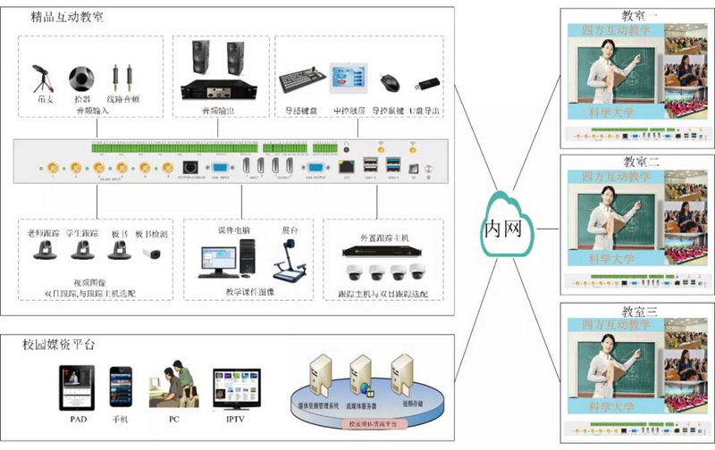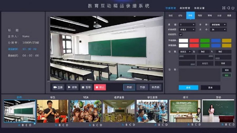 全自動錄播系統(tǒng)主要完成教師、學生的視頻自動跟蹤采集,音頻智能采集,教師電腦屏幕截取,教師/學生視頻/計算機畫面智能導播,以上信號源自動傳送至課件實時錄制系統(tǒng)生成優(yōu)質(zhì)的精品課程,同時通過課堂直播系統(tǒng)在局域網(wǎng)、互聯(lián)網(wǎng)上直播為遠端用戶提供在線實時學習的平臺。