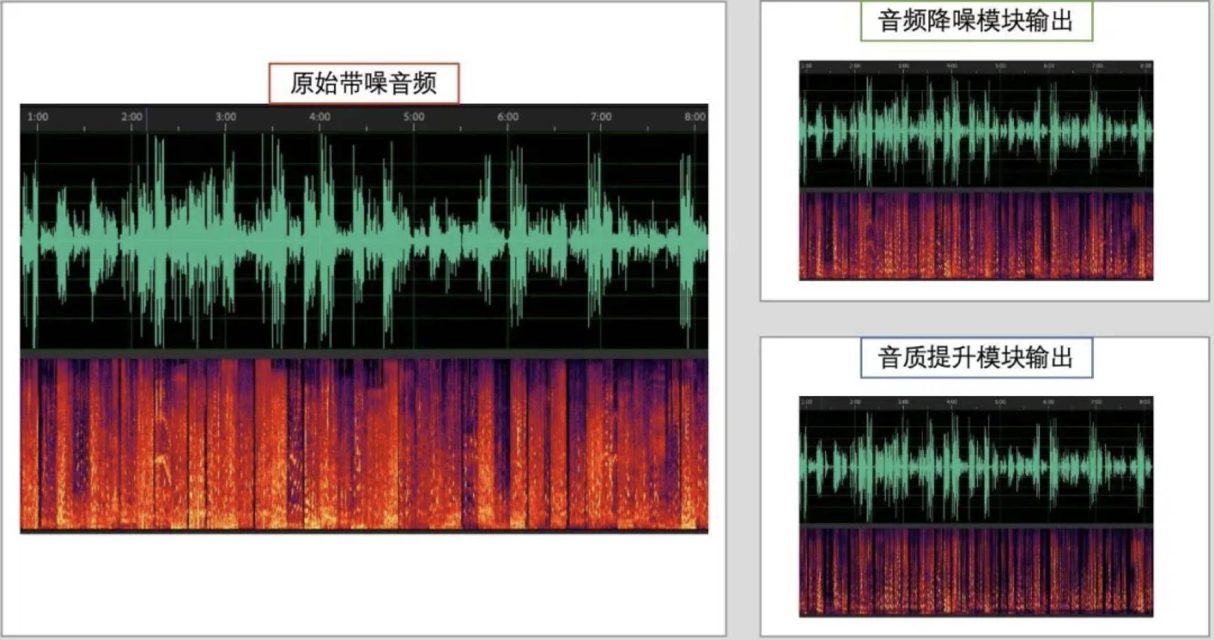 音頻降噪模塊主要是通過針對帶噪聲音頻中的干凈人聲進行建模,再提取出帶噪音頻的頻域特征,將帶噪聲音頻與干凈音頻的的頻域特征進行對比和計算,從而使AI對人聲之外常見的開門聲、鍵盤聲、走路聲等音頻具備更精準的識別能力和降噪處理,從嘈雜環(huán)境中剝離出干凈語音。