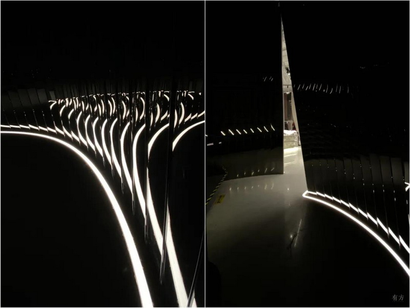 神秘的星軌“內(nèi)部”中心是收銀臺與旋轉(zhuǎn)樓梯,半封閉的樓梯作為屏幕裝置,介入到場景轉(zhuǎn)換的進程,層層疊疊的黑鈦不銹鋼板仿佛像一個黑洞,成為空間的焦點,引發(fā)了這場“星際體驗”之旅。