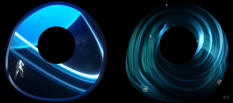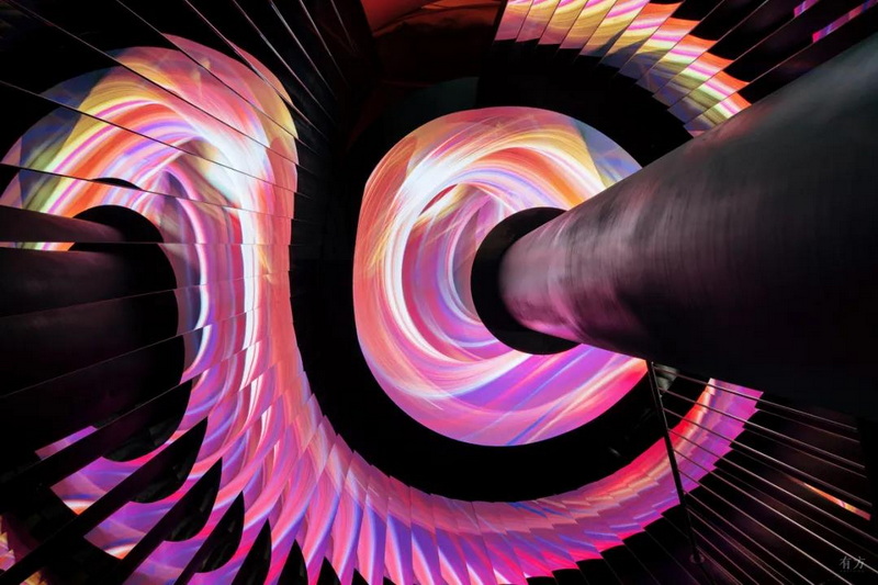 視覺團隊又在樓梯頂部放置了屏幕,在其中注入主題化的視覺內(nèi)容。屏幕被點亮的時刻,畫面被無限反射和旋轉(zhuǎn),置身其中的時間旅行者會體驗到一種短暫的扭曲時空感,預示著星際旅程的開始。