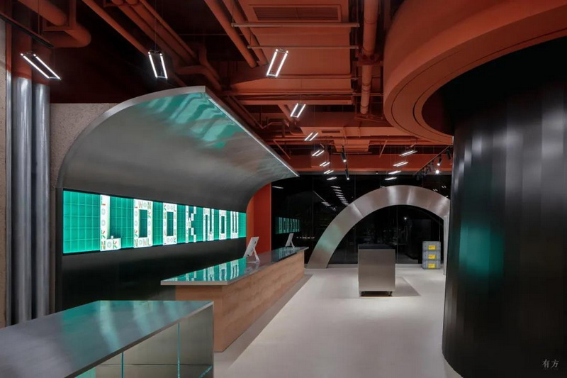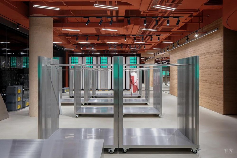 半封閉表皮將屏幕包裹在內(nèi),承接起上下場景的切換作用。圓環(huán)形的紅土色造型,實際上又內(nèi)藏了整套防火卷簾設備。更衣室是五組白色膠囊容器裝置,上部屏幕和其他裝置畫面同步聯(lián)動。店內(nèi)的金屬道具靈活多變,可以隨意組合。收銀臺也是一組裝置,背景上的一條長屏可以輸出不同主題的信息和氛圍,成為“另一個時空”的窗口。