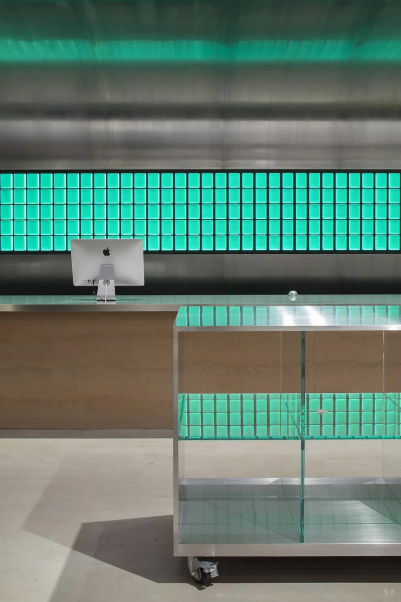 粗糙原始的墻面肌理,再現(xiàn)了現(xiàn)實世界中的月球表面。鏡面與斑駁的墻,仿佛是從星球表面遺落下來的碎片,重新匯聚在墻面上。隕石坑墻面和插入其中透光的人工物質(zhì)亞克力,產(chǎn)生出一種意外的和諧感。宛如從墻身內(nèi)部生長而出的金屬道具構件,和活動家具一起構建出一派冷酷的“仙境”。在時間的荒原里,凝結短暫的人類文化結晶。