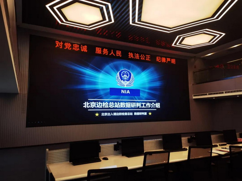 為了更好的用大數(shù)據(jù)服務(wù)邊防檢查安全工作,北京邊檢總站新建設(shè)的大數(shù)據(jù)研判中心于2021年11月正式投入使用。步入大數(shù)據(jù)研判中心,在嶄新明亮的大廳里,最引人矚目的便是正中央由GQY視訊為其打造的面積近45平米的超高清小間距LED顯示屏!皩h忠誠,服務(wù)人民,執(zhí)法公正,紀(jì)律嚴(yán)明”十六個字在大屏上赫然醒目。