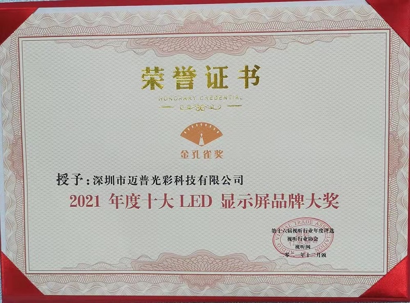 熱烈祝賀深圳邁普光彩科技有限公司榮獲顯示設(shè)備大服務(wù)商——“2021年度十大一LED顯示屏品牌大獎(jiǎng)”