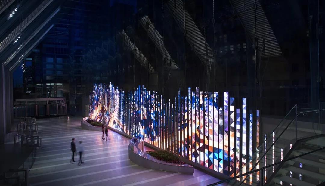這個由長短大小不一的異形屏拼接而成的巨幕長38.7米,由89個獨立的垂直懸掛LED顯示屏組成,屏幕高度和寬度各異,屏幕播放著天馬行空的絢麗影像,帶來驚艷的動感數(shù)字視覺體驗。