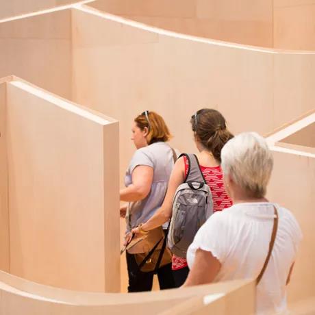 博物館與BIG-Bjarke Ingels集團(tuán)合作為博物館的歷史悠久的禮堂打造了一個前所未有的大型迷宮。這座楓木夾板結(jié)構(gòu)高約5.49米,面積為18.29米×18.29米,迷宮擁有一系列曲折的結(jié)構(gòu),供游客穿行和探索。