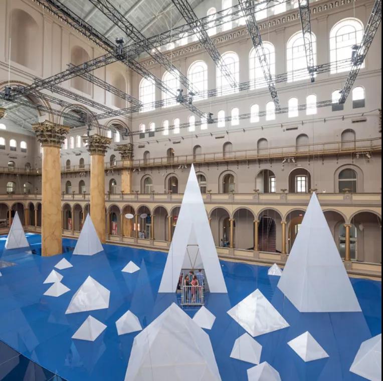 國家建筑博物館和Studio Gang在大禮堂推出最新的夏日街區(qū)派對裝置 "蜂巢"。蜂巢高聳在博物館的最上層,由2700多根纏繞的紙管搭建而成,這種建筑材料是可回收、輕質(zhì)和可再生的。這些紙管的尺寸從10到25厘米不等,并相互交錯,形成三個動態(tài)的相互連接的圓頂房間。
