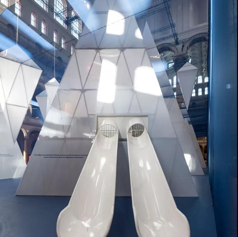 冰河由可重復(fù)使用的建筑材料建造,如腳手架、聚碳酸酯板等材料。6米高的"水位線 "可以從高處俯瞰海面,也可以將下面高聳的"貝格"之間的景色盡收眼底。最高的 "貝格 "為17米,可直接到達(dá)博物館的三層陽臺。