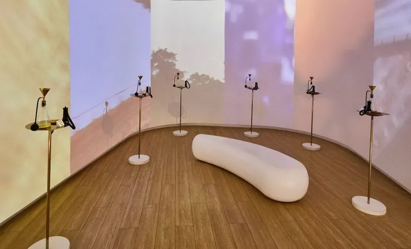 通感交互體驗區(qū):是一個結(jié)合影像,氣味,及聲音的三感體驗空間。參觀者拿起聽筒,聽到音樂的同時觸發(fā)感應(yīng),畫面便會切換到相應(yīng)的主題。擠壓香氛瓶,聞到與主題對應(yīng)的氣味。通過這樣的方式,將氣味與聽覺、視覺連通,留下更深入的印象。