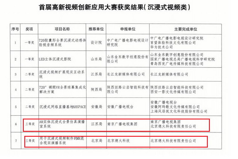 當日主題報告會上,首屆高新視頻創(chuàng)新應用大賽頒獎儀式在北京國際會議中心隆重舉行。經(jīng)過專家組委會層層篩選,千家企業(yè)強強角逐,北京德火科技、南京廣播電臺&北京德火科技通過5G應用、技術演示、效果呈現(xiàn)等多方面優(yōu)異表現(xiàn),經(jīng)過多番評審,最終憑借《沉浸式視頻制作的MR混合現(xiàn)實演播系統(tǒng)》、《AR實體沉浸式全景仿真演播室系統(tǒng)》獲得沉浸式視頻類三等獎。