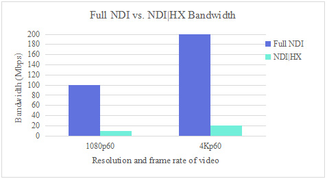 Full NDI的壓縮在視覺上幾乎無損,因此Full NDI的IP流對(duì)帶寬的要求更高。一般1080p60 FULL NDI碼流占用100Mbps左右?guī)挘?Kp60視頻流需要200Mbps左右。在相同的視頻源和傳輸網(wǎng)絡(luò)環(huán)境下,使用H.264格式壓縮的NDI|HX視頻流所需的帶寬降低了約90%,即1路1080p60視頻僅需10Mbps左右,一路4Kp60視頻只需要20Mbps左右,NDI|HX的延遲明顯要高于Full NDI。