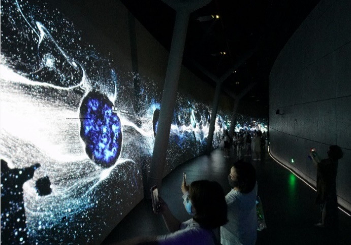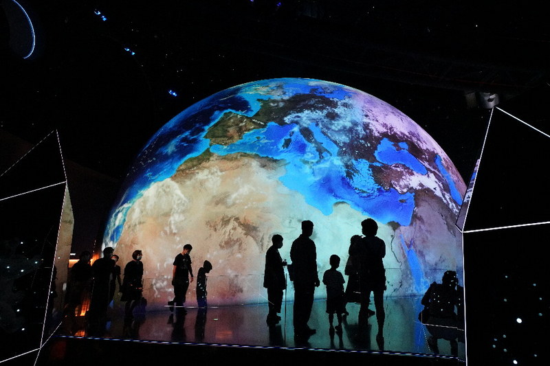 來(lái)到“家園”展區(qū), “地球變遷”展項(xiàng)格外引人矚目。這是由七臺(tái)科視Christie D20WU-HS 激光投影機(jī)在直徑 20 米的巨型旋轉(zhuǎn)球體上呈現(xiàn)出令人嘆為觀止的圖像。另外,“星際穿越”是一幅長(zhǎng)達(dá)60米的巨型幕墻,10 臺(tái)科視Christie DWU1075-GS 激光投影機(jī)投射出引人入勝的互動(dòng)投影。D20WU-HS 和 DWU1075-GS 的亮度分別為 20,600 和 10,875 流明,都配備了科視Christie BoldColor 技術(shù),可精準(zhǔn)地平衡色彩并還原繽紛的圖像,同時(shí)不影響亮度。在其它展館中,三臺(tái)科視Christie 4K7-HS 激光投影機(jī)帶來(lái)了超精細(xì)的 4K 天體圖像,它們擁有 4K 超高清分辨率,以