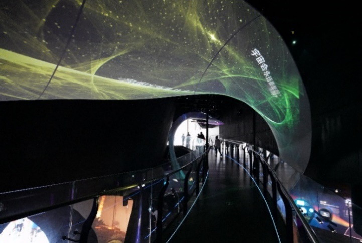 “征程”展區(qū)中的“未解之謎”展項(xiàng)令人過(guò)目難忘,長(zhǎng)度約50米的光影飄帶包裹環(huán)繞觀眾出口走廊,并緩緩運(yùn)動(dòng)。出色的影像效果由10臺(tái)科視DWU630-GS激光投影機(jī)呈現(xiàn)。未解之謎光影飄帶的迷人效果是通過(guò)科視Christie 潘多拉魔盒 V8 軟件實(shí)現(xiàn),其強(qiáng)大精準(zhǔn)的3D曲面矯正工具、三維True 3D渲染引擎和開(kāi)放的多協(xié)議交互平臺(tái)“窗口部件設(shè)計(jì)器”,最終呈現(xiàn)了宇宙飄帶的瑰麗視效。