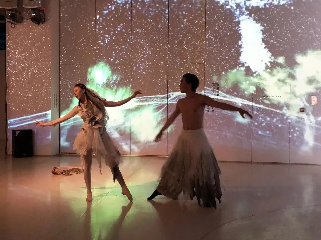 演出過程中設(shè)置了大量的引導(dǎo)性互動(dòng),通過高度儀式化的藝術(shù)性肢體動(dòng)作,精心設(shè)計(jì)的環(huán)節(jié),象征寫意化的數(shù)字視覺背景,突破現(xiàn)實(shí)時(shí)空的局限和慣性思維的束縛,打破具象化的窠臼。