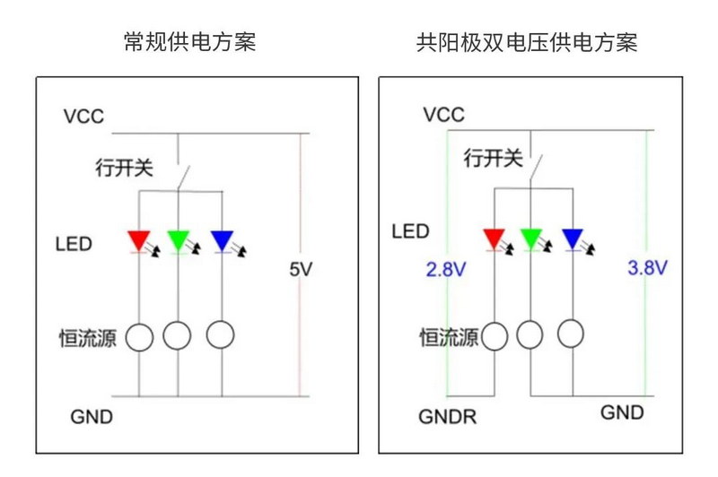 與常規(guī)產(chǎn)品對比顯示:共陽極雙電壓供電節(jié)能產(chǎn)品,整屏功耗較常規(guī)產(chǎn)品明顯下降。