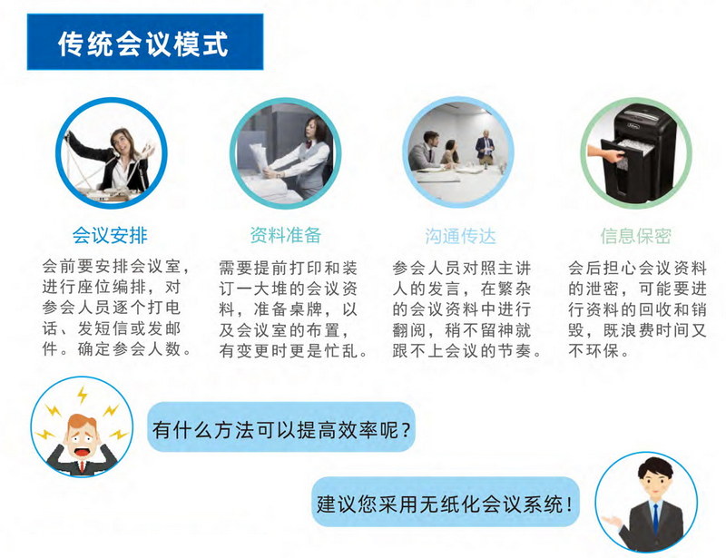 在政府機(jī)關(guān)、科研機(jī)構(gòu),和各企事業(yè)單位,每年各種會(huì)議較多,會(huì)議材料用紙量較大,印制等各種費(fèi)用較高,人力及時(shí)間消耗較多,不僅增加成本,而且也不適應(yīng)信息化時(shí)代的發(fā)展。同時(shí)與建設(shè)一個(gè)高效,節(jié)能,環(huán)保的社會(huì)也不相稱(chēng)。無(wú)紙化不僅能大大提高工作效率,對(duì)環(huán)保節(jié)能也具有深遠(yuǎn)的意義。