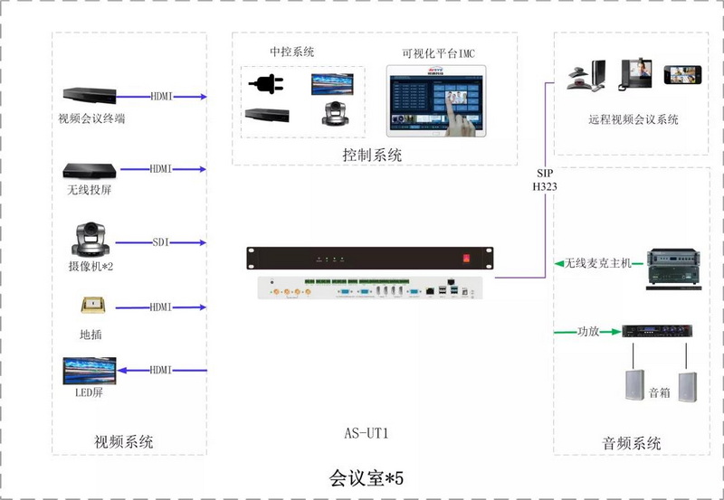 本項(xiàng)目使用5臺(tái)視通科技UT1音視頻綜合一體機(jī),產(chǎn)品集音頻系統(tǒng),視頻系統(tǒng),遠(yuǎn)程會(huì)議系統(tǒng),中控系統(tǒng)應(yīng)用為一體,通過可視化管理平臺(tái)可對(duì)會(huì)議室內(nèi)的燈光、空調(diào)、窗簾、音量等進(jìn)行控制,實(shí)現(xiàn)會(huì)議室互聯(lián)互通,音視頻信號(hào)統(tǒng)一管控等應(yīng)用。