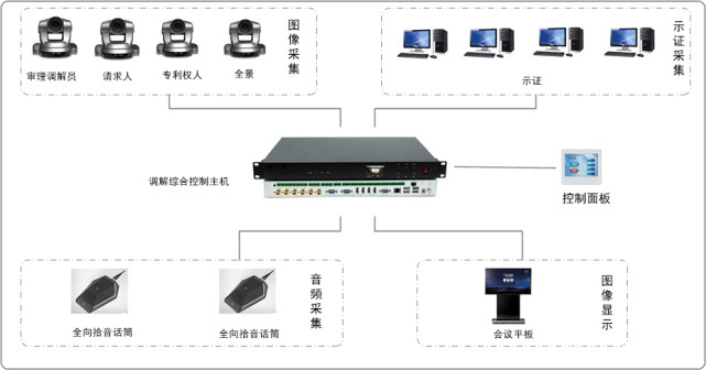 數(shù)字審理綜合控制主機(jī)、調(diào)解綜合控制主機(jī)、應(yīng)用電腦、圖像采集、證據(jù)采集、顯示輸出、旁聽(tīng)及信息展示、音頻采集、音響擴(kuò)音、可視化集中控制終端、同聲傳譯、存儲(chǔ)擴(kuò)容。