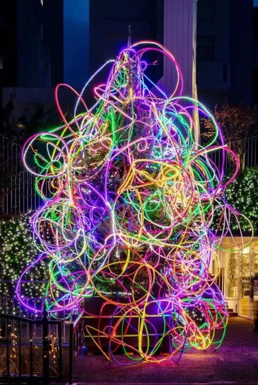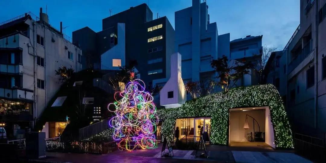 為慶祝日本建筑師藤本壯介設(shè)計(jì)的白屋酒店開(kāi)業(yè)一周年,藝術(shù)家kengo kito大膽使用 2,500 個(gè)不同顏色的呼啦圈創(chuàng)作了一個(gè)公共藝術(shù)雕塑,裝飾了外面四米高的圣誕樹(shù)。