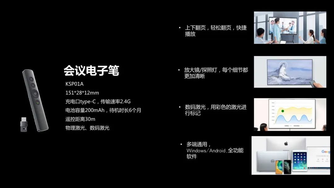 會議電子筆則是AirHub BK20 的明星配件,別看小身材,卻有大用途:它的鼠標用途,可以做到近乎無感地上下翻頁;放大鏡/探照燈功能,讓屏幕上的細節(jié)都可以充分清晰展現(xiàn);而數(shù)碼激光用途,則可秀出彩色激光,用以在大屏上進行標記。