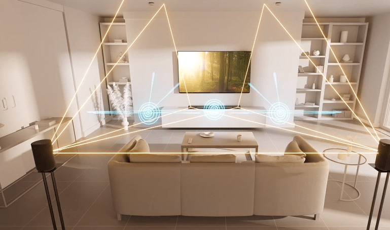 360SSM技術(shù)首先通過內(nèi)置麥克風(fēng)測量回音壁和后環(huán)繞音箱的相對高度和位置,并根據(jù)房間布局自動(dòng)優(yōu)化聲音;再基于位置信息合成聲波來創(chuàng)建多個(gè)真實(shí)發(fā)聲的幻像揚(yáng)聲器,發(fā)出球狀聲波,構(gòu)建出比實(shí)體揚(yáng)聲器范圍更寬廣的聲場,打造全方位環(huán)繞、極具沉浸感的聆聽效果。用戶使用產(chǎn)品時(shí),不用再受傳統(tǒng)家影精確擺放位置和繁瑣布線的困擾,通過輕松靈活地?cái)[放,就能打造出對自己家庭環(huán)境來說理想的穹頂式全方位廣域環(huán)繞聲場。