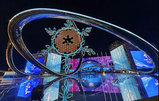 藝術(shù)與工程充分融合,純粹的冰雪元素和靈動飄逸的絲帶相向旋轉(zhuǎn),象征著純潔、和平、團結(jié)和友誼的理念。