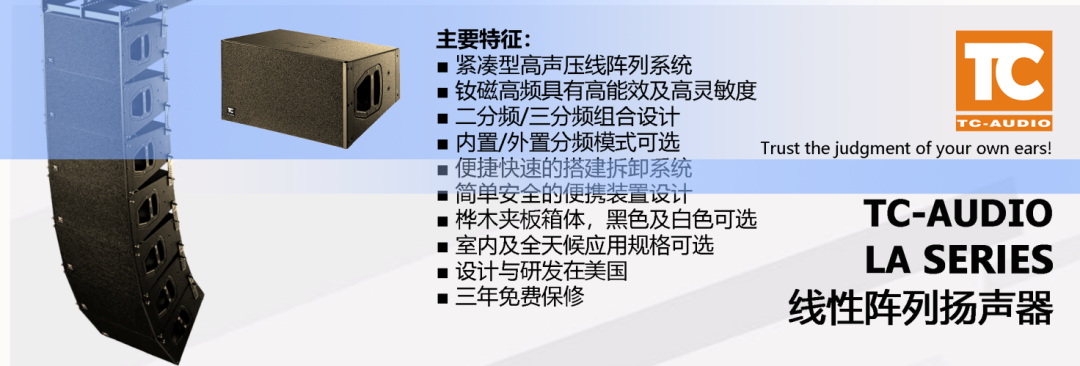 為適應(yīng)于該會議中心的展覽、會議、綜合活動等多功能用途,揚(yáng)聲器系統(tǒng)設(shè)計(jì)為流動式,18只TC-AUDIO LA210雙10線陣全頻、4只TC-AUDIO LA118S單18線陣超低,既可作為一套大型演出擴(kuò)聲系統(tǒng),亦可適用于會場拆分為多個(gè)場所的擴(kuò)聲系統(tǒng)使用。配置有4只TC-AUDIO MC112流動式舞臺返送揚(yáng)聲器、4只TC-AUDIO MC110輔助揚(yáng)聲器。搭配15臺TC-AUDIO DA系列數(shù)字功率放大器。