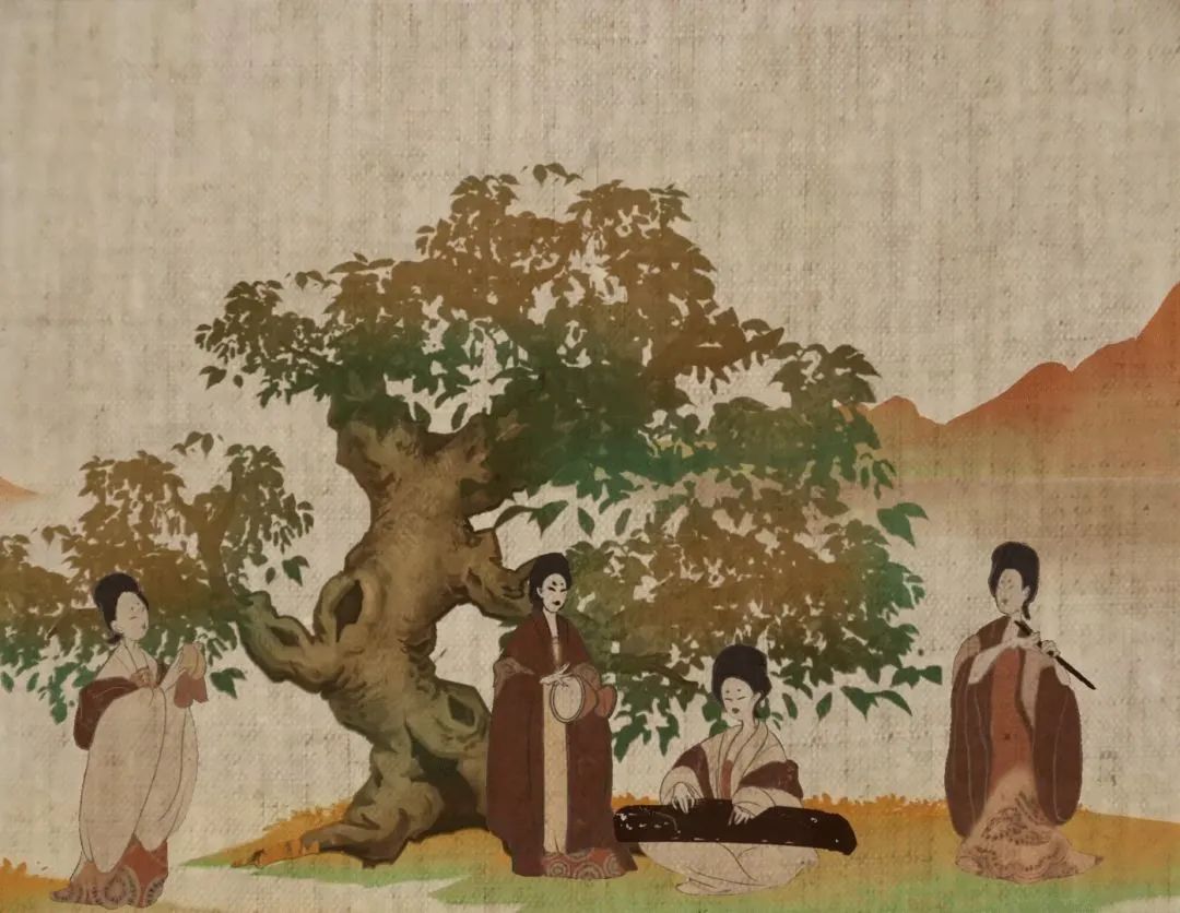 屏風(fēng)徐徐展開,宮中仕女從畫中出現(xiàn),在彈琴奏樂中思緒紛飛出宮門,徜徉在想象山水之間,最終曲終人散,屏風(fēng)閉合。體現(xiàn)出貴族仕女養(yǎng)尊處優(yōu)、無所事事、游戲于花蝶鶴犬之間的生活情態(tài)。