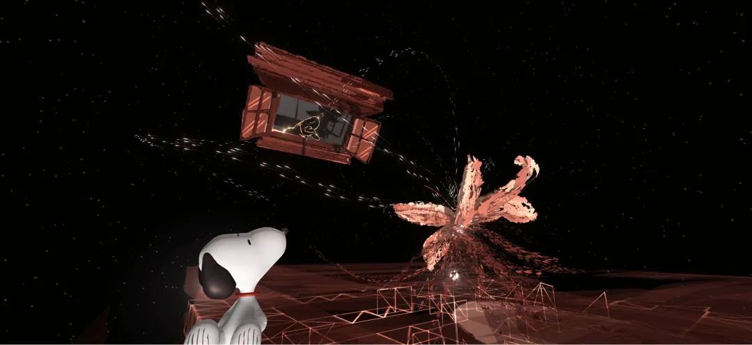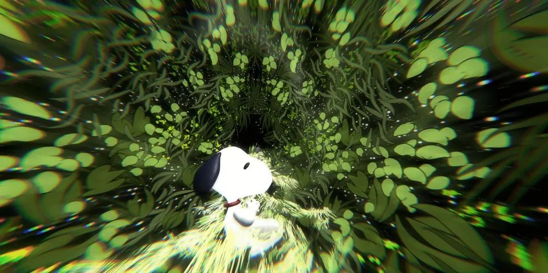 作品讓觀眾隨著史努比動(dòng)漫形象在虛實(shí)之間尋找童年回憶中遺失的美好。運(yùn)用VR虛擬現(xiàn)實(shí)光繪、3D掃描等技術(shù),用視聽語言創(chuàng)造出瑰麗的光影世界。