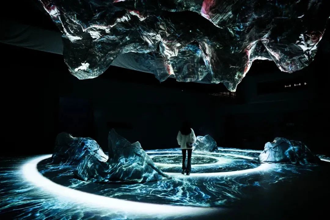 通過傳統(tǒng)藝術(shù)的數(shù)字活化將江山圖各部分動(dòng)態(tài)化數(shù)字化,分別以古人與今人的視角對(duì)作品重新審視與建構(gòu)。以大觀小、曠觀、神游、浸入式的視覺體驗(yàn)、散點(diǎn)透視與焦點(diǎn)透視的自由切換,讓觀眾在現(xiàn)代與傳統(tǒng)、科技與藝術(shù)之間來回穿梭,在形式上通過光學(xué)鏡面反射的原理,將空間向外延展,從而形成一個(gè)無限延伸的廣闊空間,讓觀眾仿佛置身于千里江山之中,感受壯麗山河中所傳達(dá)出自信與氣勢(shì)。