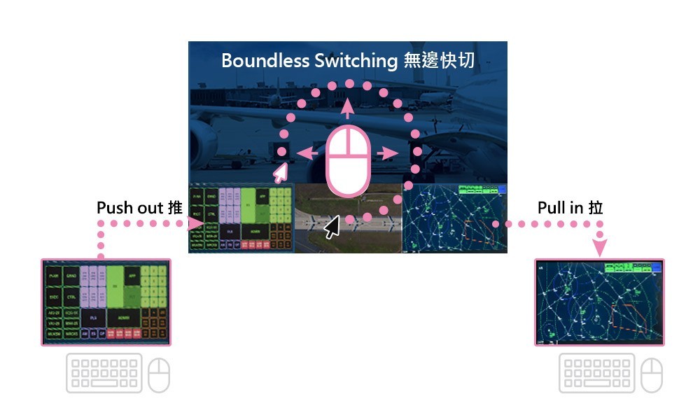 KX9970F內(nèi)建ATEN無邊快切專利技術(shù),整合電視墻使用,讓管理員使用直觀式切換―移動(dòng)鼠標(biāo)光標(biāo)跨過畫面邊框到另一個(gè)欲操控的畫面,快速響應(yīng)突發(fā)事件。電視墻的所有畫面都可以「推」及「拉」,若需要同時(shí)在工作站與電視墻,快速協(xié)作、分享及排除故障,「推拉」功能,有助于簡化控制室作業(yè)流程、做出明智決策。