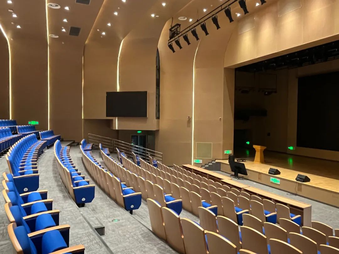 音箱的安裝位置和聲輻射方向,保證了觀眾席中各處有合適的響度、均勻度、清晰度和豐滿度,在觀眾和講臺的后墻,適當(dāng)吸聲處理,減少后部反射聲,天花和側(cè)墻則作為反射面處理,用配置擴散結(jié)構(gòu)進行聲折射和擴散,以增強早期反射聲,提高語言清晰度、使聲場分布均勻,同時利用天花頂和側(cè)墻后的空間設(shè)置低頻吸聲結(jié)構(gòu),減少低頻混響時間。