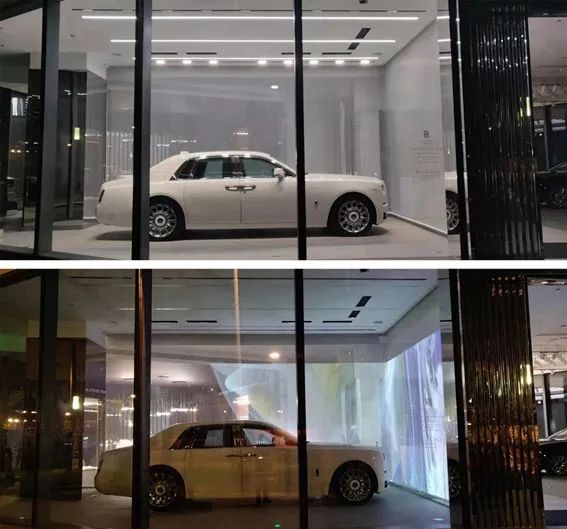 在上海浦西勞斯萊斯汽車店的紗幕投影,采用升降紗幕搭配超短焦激光投影機(jī)疊加投影來實(shí)現(xiàn)。
