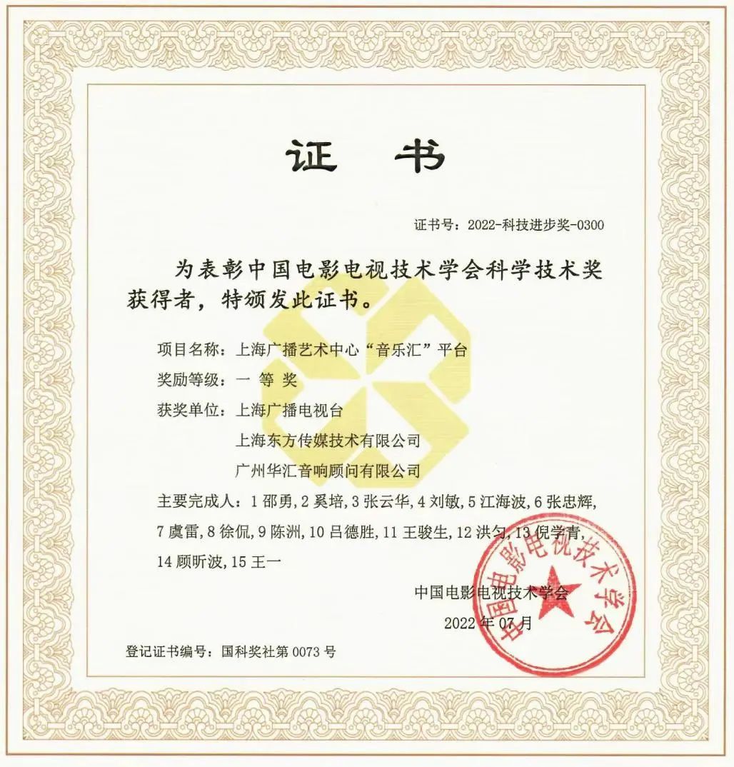 近日,第十五屆中國(guó)電影電視技術(shù)學(xué)會(huì)科技進(jìn)步獎(jiǎng)終評(píng)結(jié)果正式公布。由上海廣播電視臺(tái)、上海東方傳媒技術(shù)有限公司和華匯音響顧問(wèn)有限公司共同完成的上海廣播藝術(shù)中心“音樂(lè)匯”平臺(tái)項(xiàng)目榮獲中國(guó)電影電視技術(shù)學(xué)會(huì)科學(xué)技術(shù)獎(jiǎng)一等獎(jiǎng)!