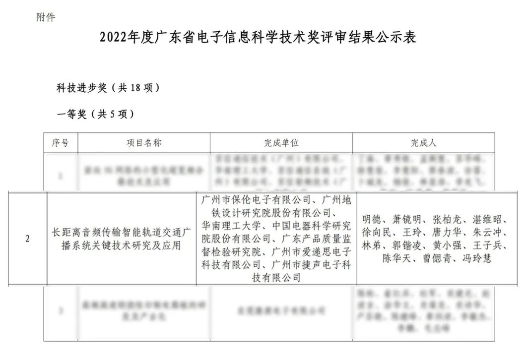 為推動(dòng)廣東省科學(xué)技術(shù)進(jìn)步,激勵(lì)自主創(chuàng)新、鼓勵(lì)開放合作、突出價(jià)值導(dǎo)向,注重成果質(zhì)量和貢獻(xiàn),充分調(diào)動(dòng)廣大科技工作者科技創(chuàng)新的積極性和創(chuàng)造性。廣州市保倫電子有限公司主動(dòng)作為、勇于創(chuàng)新,牽頭參與制定了“長(zhǎng)距離音頻傳輸智能軌道交通廣播系統(tǒng)關(guān)鍵技術(shù)研究及應(yīng)用”。