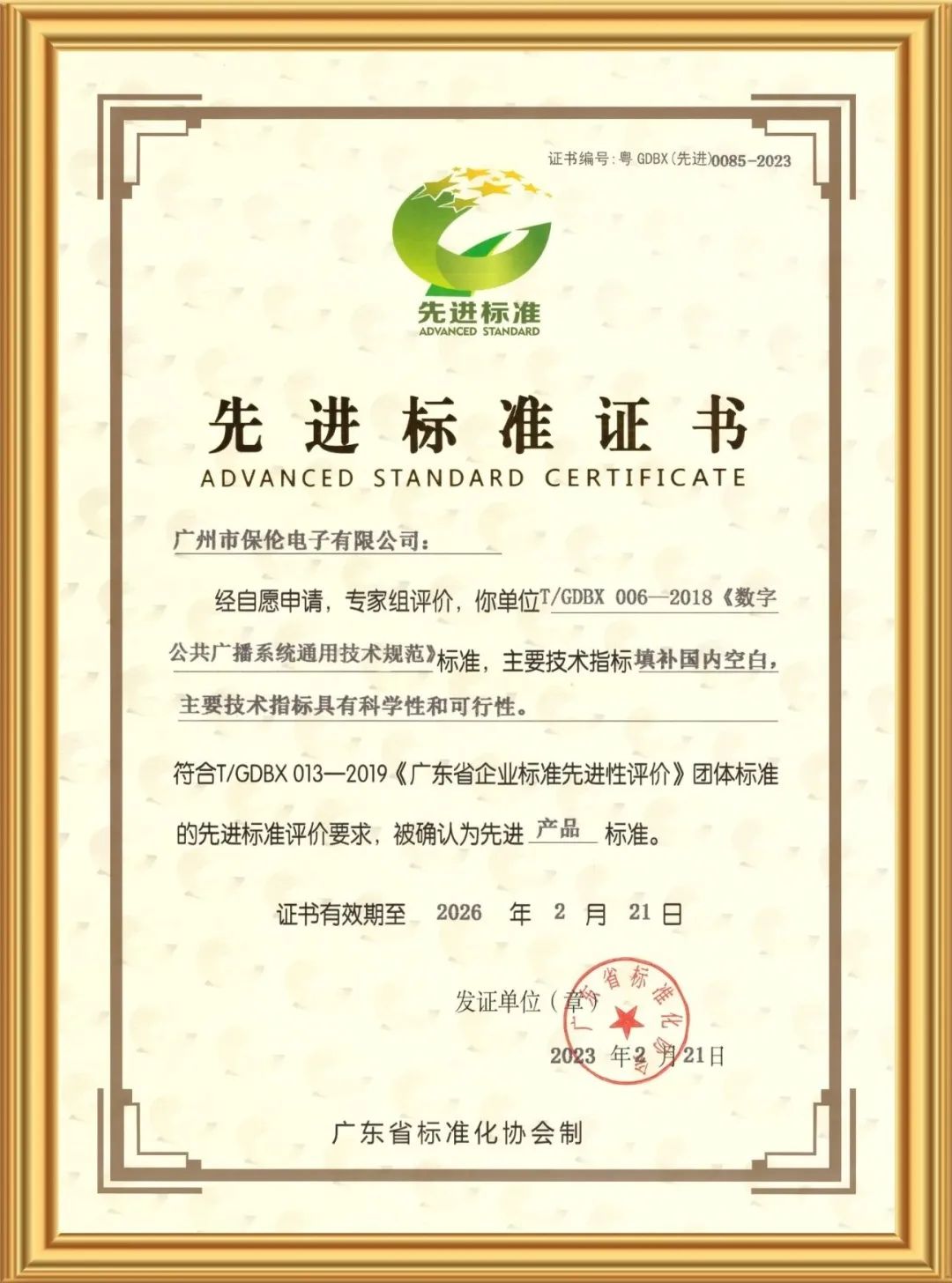 2月20日,經(jīng)廣東省標(biāo)準(zhǔn)化協(xié)會(huì)專家組評(píng)審決定,廣州市保倫電子有限公司(簡(jiǎn)稱保倫電子itc)主導(dǎo)制定并實(shí)施的T/GDBX 006—2018《數(shù)字公共廣播系統(tǒng)通用技術(shù)規(guī)范》團(tuán)體標(biāo)準(zhǔn)被評(píng)為廣東省先進(jìn)標(biāo)準(zhǔn)。專家組確認(rèn)該標(biāo)準(zhǔn)的“產(chǎn)品主要技術(shù)指標(biāo)填補(bǔ)國(guó)家標(biāo)準(zhǔn)、行業(yè)標(biāo)準(zhǔn)空白”。保倫電子itc是廣東省第二批獲得“先進(jìn)標(biāo)準(zhǔn)證書”企業(yè)。