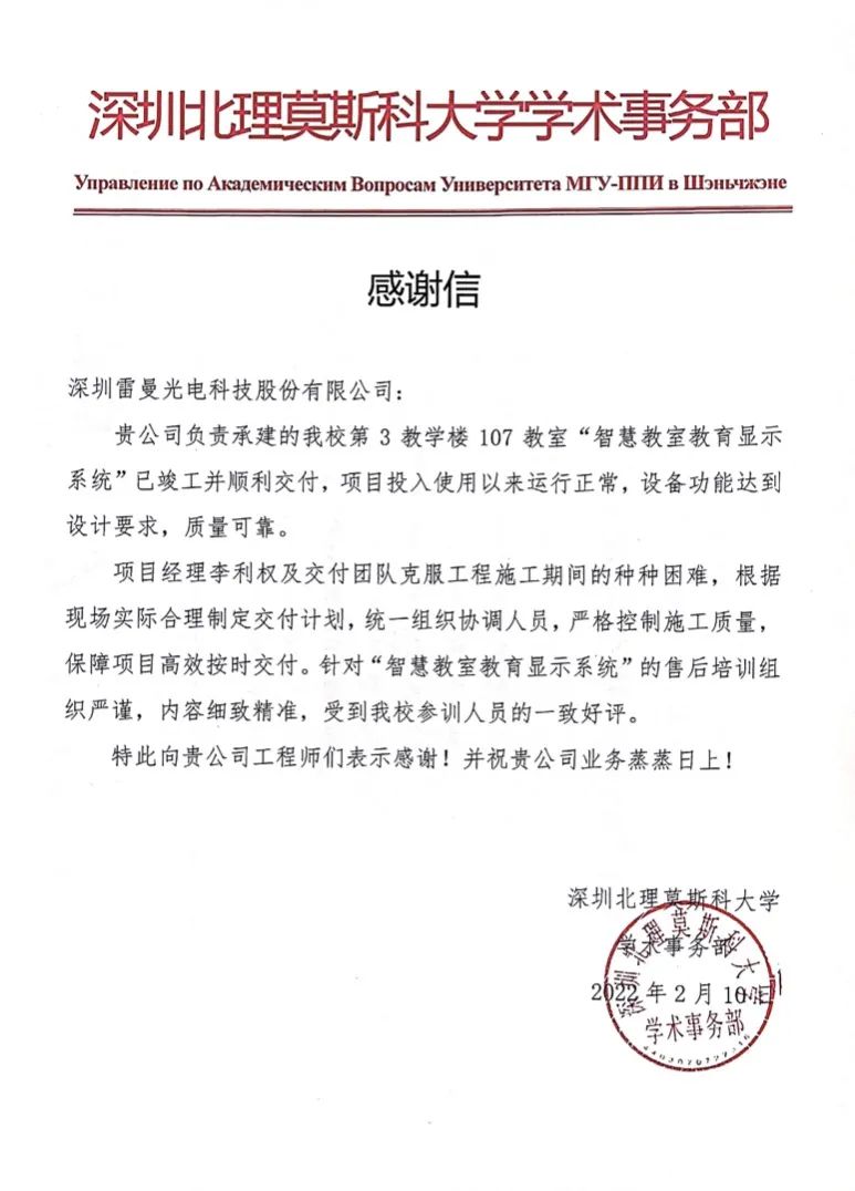 雷曼優(yōu)質(zhì)的產(chǎn)品和服務(wù)也獲得了深北莫的認可和肯定。此前,深北莫向雷曼發(fā)來一封感謝信,感謝雷曼在承建深圳北理莫斯科大學第3教學樓107教室“智慧教室教育顯示系統(tǒng)”項目期間,保障項目高效按時交付,售后培訓嚴謹細致,用實際行動踐行企業(yè)社會責任,以LED高科技力量助推智慧校園建設(shè)。