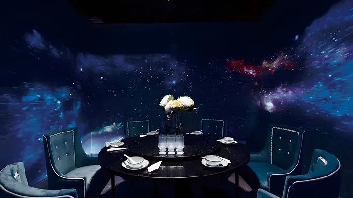 大面積的視頻影像可以帶領用餐者進入全新的虛擬空間,不同的主題還能呈現(xiàn)不一樣的效果,例如海底、星空等場景都可打造,能給用餐者帶來新穎的體驗感。