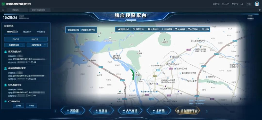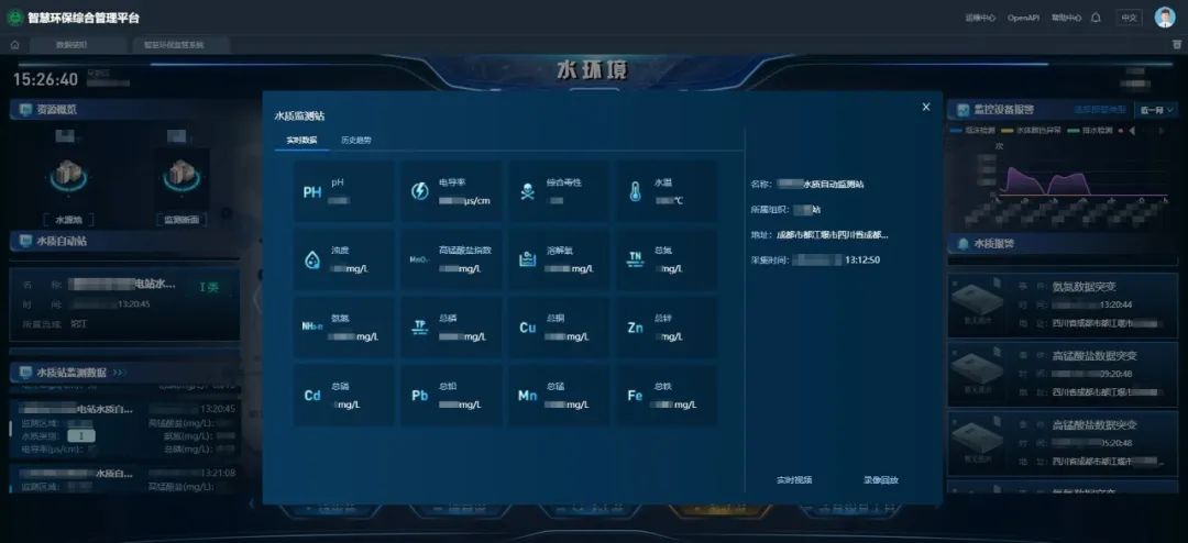 通過水質(zhì)監(jiān)測站、大氣監(jiān)測站等,水環(huán)境能基于各項數(shù)據(jù)更科學(xué)地展現(xiàn),管理中心統(tǒng)一匯聚、整合多方數(shù)據(jù)資源并地圖可視化展示,使得內(nèi)場運維人員可以在一個系統(tǒng)上完成對水環(huán)境各項指標(biāo)的快速巡檢,及時了解區(qū)域內(nèi)的水質(zhì)情況。