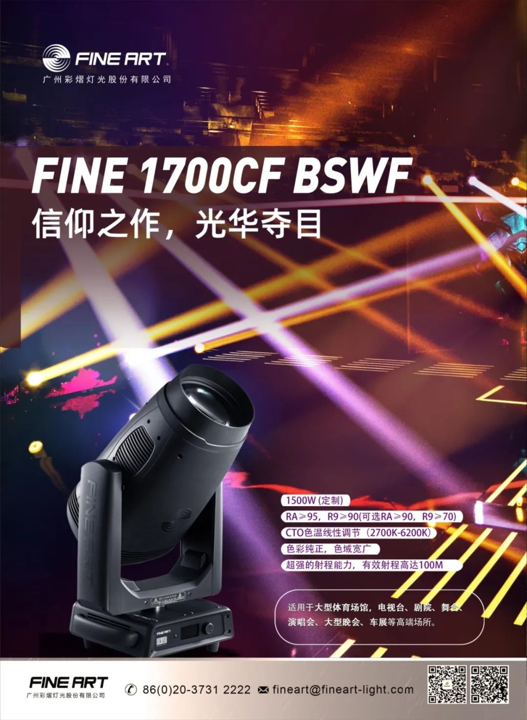 彩熠FINE 1700CF BSWF四合一搖頭燈,集光束、染色、圖案、切割于一身,擁有著澎湃動力,強勁的1500W、6000K專有LED燈光引擎,輕松打造奪目光影,在高端演出市場備受青睞。