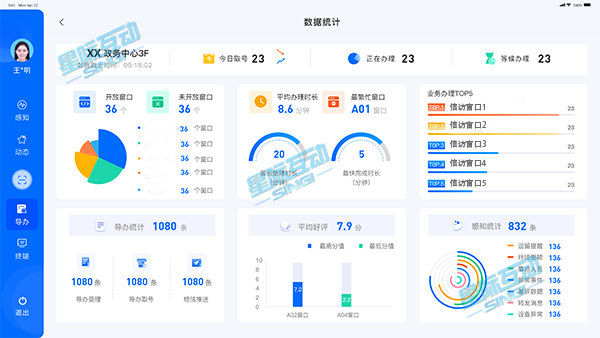 多維度展現(xiàn)大廳虛擬化場景,按照實景比例縮放,在大屏幕上展示,主要顯示大廳各區(qū)域工作狀態(tài)、各設(shè)備運行狀態(tài)、各崗位辦公人員信息、各崗位在崗情況等;