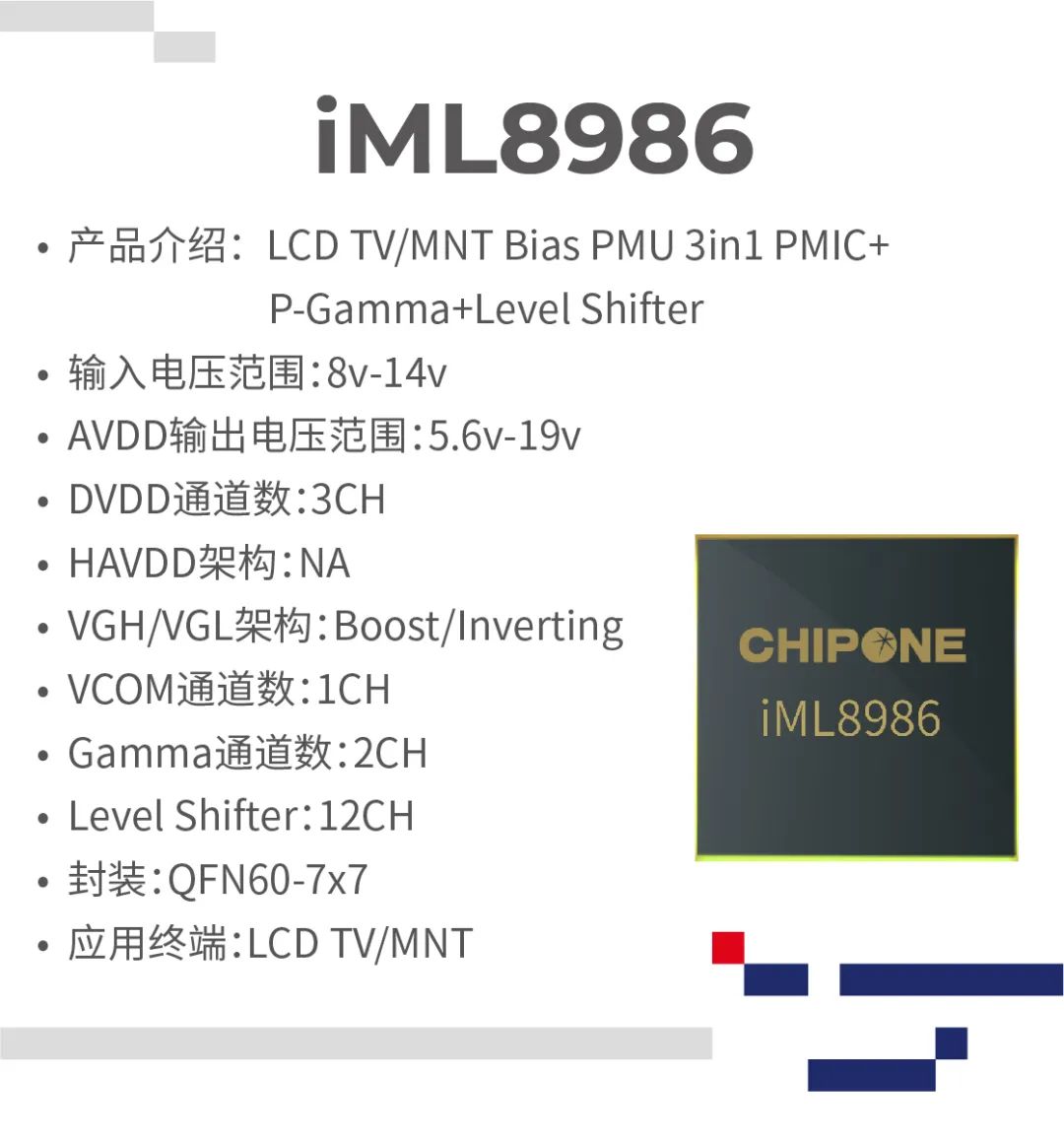 作為集創(chuàng)北方在顯示電源管理芯片領域的重要產(chǎn)品之一,iML8986是一顆具有高度整合性的電源管理IC,該產(chǎn)品可用于TFT、LCD面板,能夠完美適配各品牌中高端顯示器、TV等顯示應用產(chǎn)品。iML8986具有優(yōu)異的靜態(tài)電流消耗管理能力以及高效率的電源輸出,能夠提升顯示器設備在各種應用負載下的功耗表現(xiàn)以及系統(tǒng)整體的運行效率,且該產(chǎn)品更容易通過各國各地區(qū)的節(jié)能減排規(guī)范要求;高質(zhì)量低波紋的電源輸出能夠給面板提供更加穩(wěn)定的畫面;彈性廣闊的SR調(diào)整能夠有效的避免系統(tǒng)電磁干擾問題。