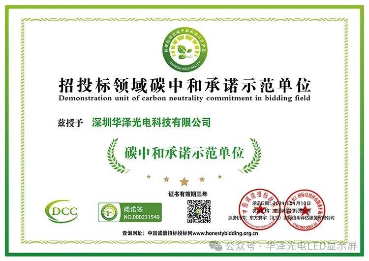 華澤光電作為深耕LED顯示屏13年的高新技術(shù)企業(yè),積極響應(yīng)國家政策,勇于承擔(dān)企業(yè)社會責(zé)任,促進技術(shù)研發(fā)創(chuàng)新,不斷探索并實踐綠色低碳發(fā)展道路。近日,華澤光電榮獲“招標(biāo)投標(biāo)領(lǐng)域碳中和承諾示范單位”,這一榮譽不僅是對華澤光電的高度認可,更是對其在碳中和領(lǐng)域所做出的杰出貢獻的贊譽。