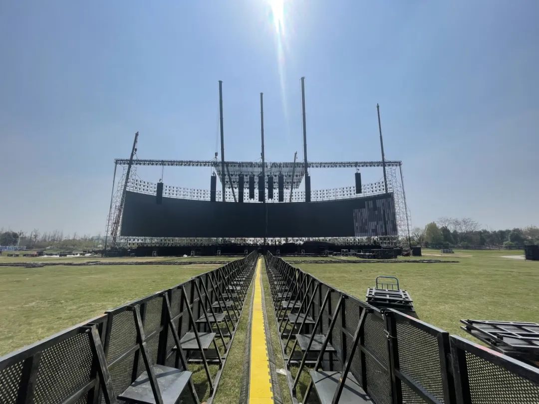 七臺(tái)大型吊車吊掛起5倍于傳統(tǒng)音樂(lè)節(jié)的音箱數(shù)量和舞臺(tái)頂棚
